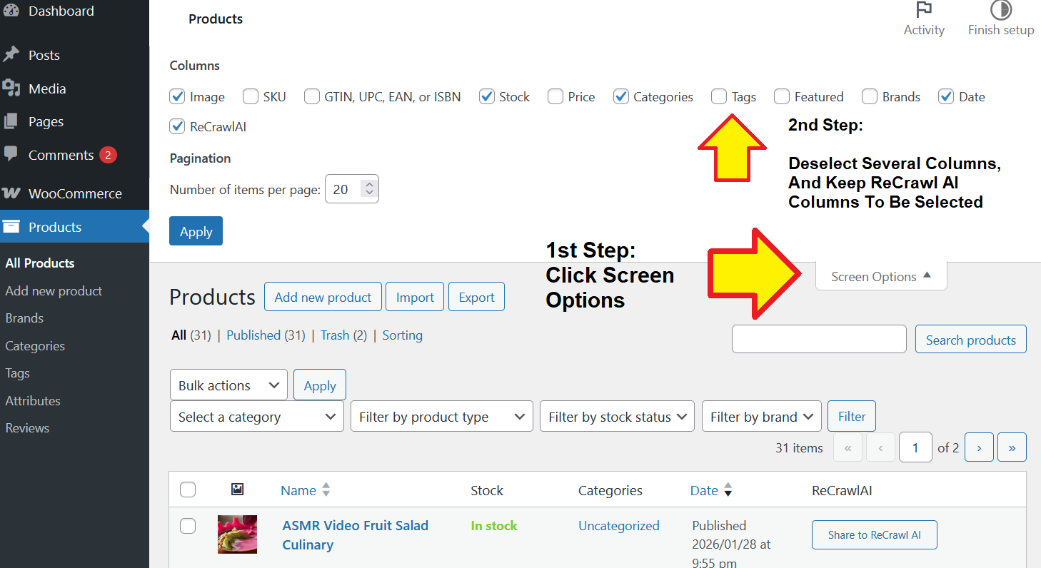 In WooCommerce Products List, The ReCrawl Share Button Is Not Displaying?